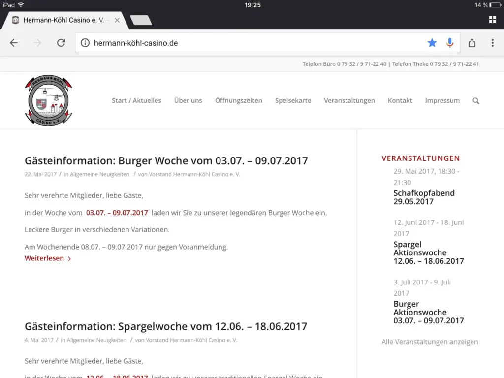 Das Hermann-Köhl-Casino in Niederstetten ist das Offizierskasino des dortigen Bundeswehrstandortes. Bereits im 4. Quartal 2015 begannen die grundlegenden Arbeiten an diesem Web-Projekt – alles fing mit der Registrierung der Domain an. Die Besonderheit: auf Kundenwunsch wurde eine Adresse mit internationalisiertem Domainnamen (ugs. Umlaut-Domain) angemeldet. Aus technischer Sicht verlief die Grundinstallation und Einrichtung des Web-CMS nach kleinen Modifikationen beim Hosting problemlos. Natürlich wurde auch bei dieser Website der Fokus auf Responsive Design gelegt, die Anzeige ist für Desktop-Browser sowie Tablets und Smartphones optimiert.